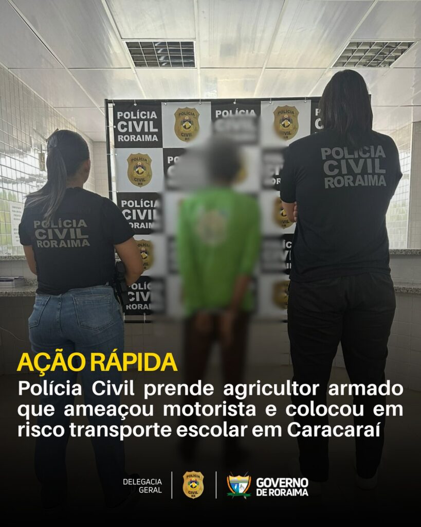 A PCRR (Polícia Civil de Roraima), por meio da Delegacia de Polícia de Caracaraí, prendeu em flagrante nesta quarta-feira, dia 05, o agricultor V. S. S., de 62, que ameaçou de morte o motorista de uma van responsável pelo transporte escolar na zona rural do município, representando grave risco aos trabalhadores e alunos atendidos pelo serviço público.
