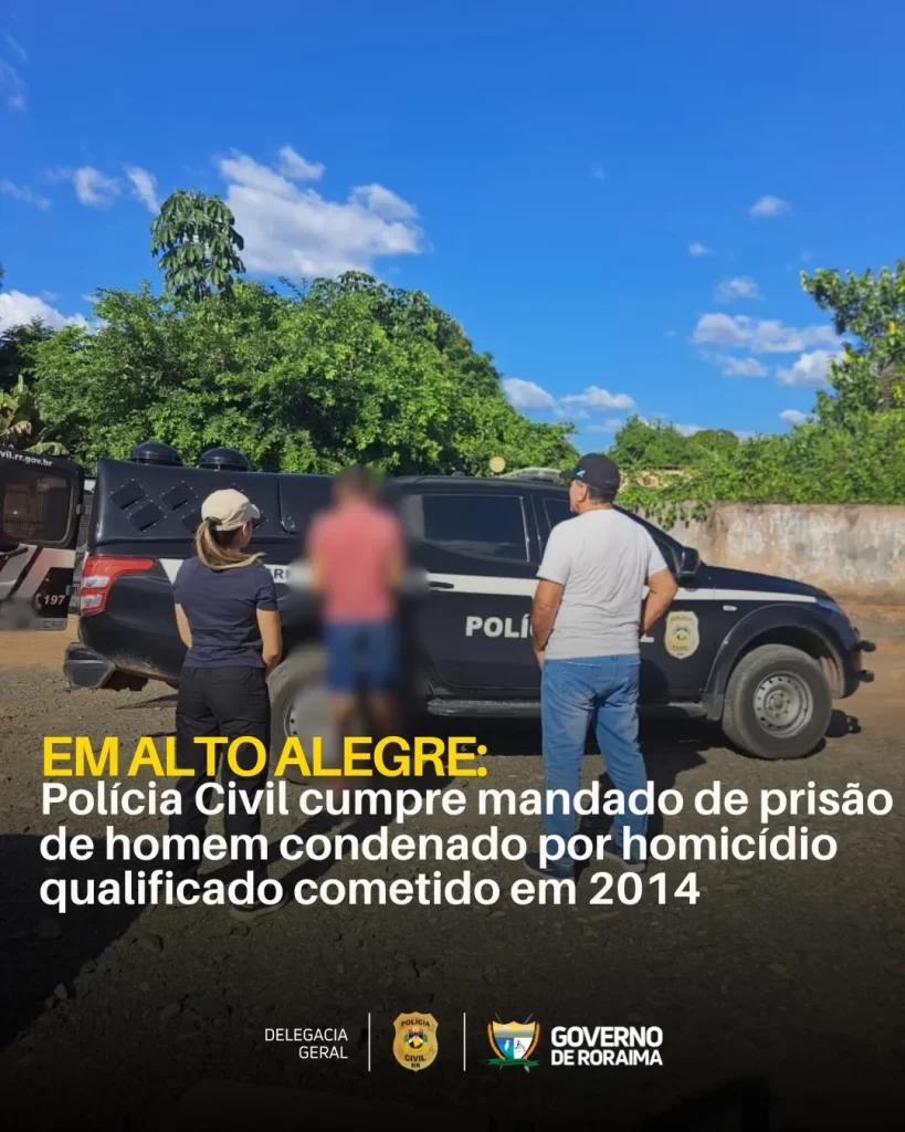 Investigações realizadas pela PCRR (Polícia Civil de Roraima) por meio da Delegacia do município de Alto Alegre, resultaram no cumprimento do mandado de prisão contra H.S.M., de 31 anos, condenado por homicídio qualificado, ocorrido no ano de 2014. O homem foi localizado e preso ontem, dia 26, na sede do município de Alto Alegre.