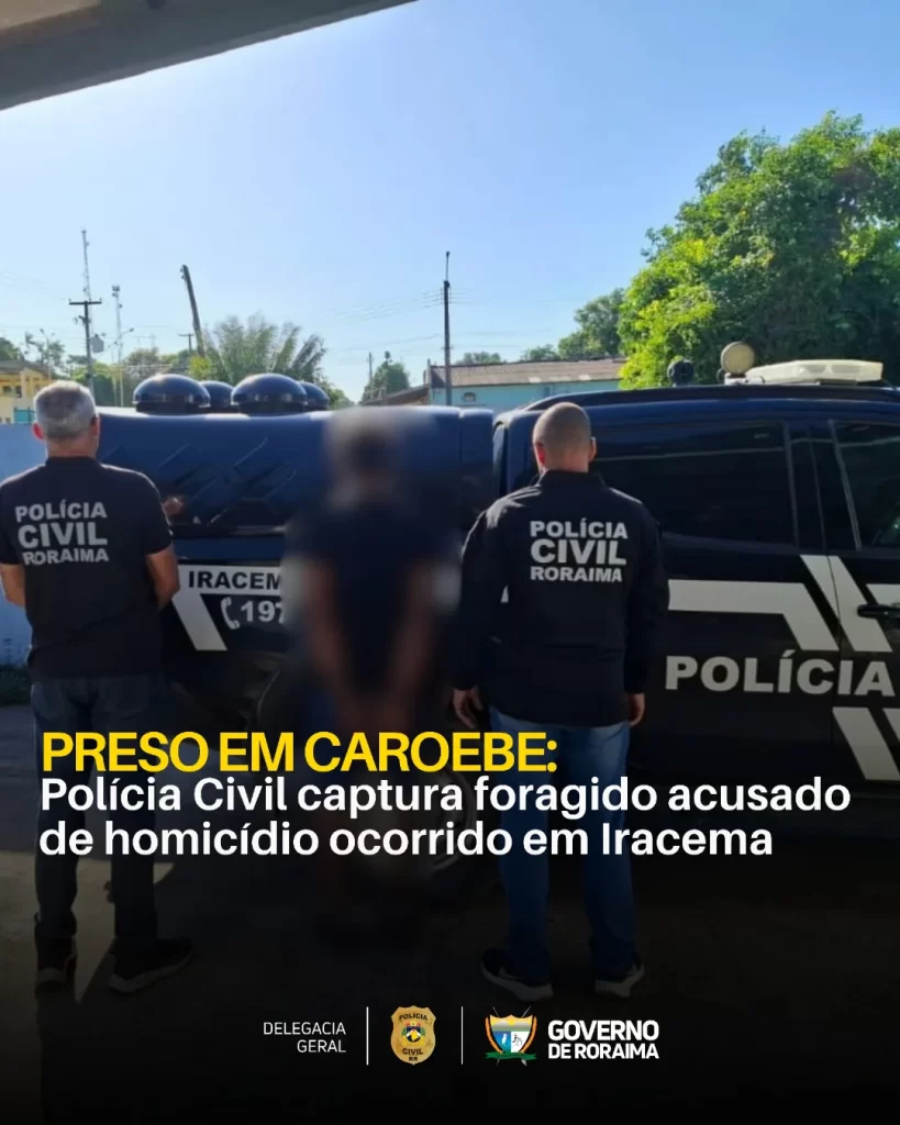 Diligências realizadas por 48 horas na região de Caroebe pela equipe da PCRR (Polícia Civil de Roraima), lotada na Delegacia de Iracema, resultaram na localização e prisão de C. M. A. C., de 31 anos, conhecido como “Marquinhos Canela”, acusado de homicídio qualificado contra Cleyton Carneiro da Silva, de 29 anos. O crime ocorreu em 24 de março de 2024, no município de Iracema e, desde então, eram realizadas diligências para localizá-lo.
